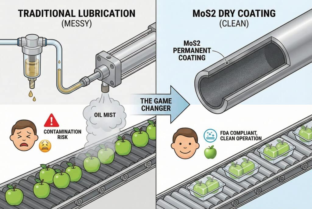 Nedávno som navštívil Johna, vedúceho údržby vo veľkom závode na balenie ovocia v Kalifornii. Bol pod obrovským tlakom, pretože Audítori FDA2 upozornil na potenciálne riziko kontaminácie olejom v blízkosti svojich dopravníkových pásov. Z výfukových otvorov jeho štandardných valcov unikala olejová hmla. Potreboval riešenie, ktoré by bolo čisté, suché a spoľahlivé. V tom mu pomohli tuhé mazivá. 🍏